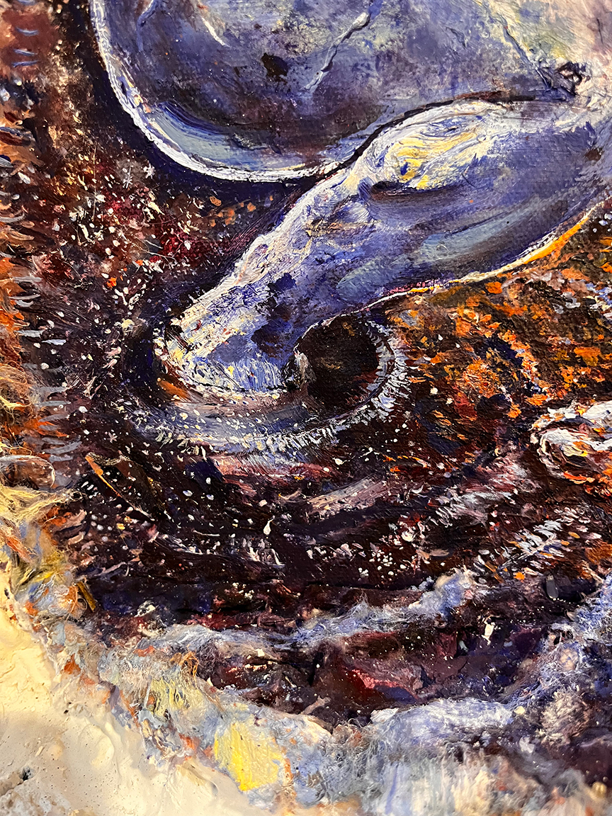 The twigs were originally intended to be in their natural state while framing the canvas. However, I discovered plaster at the architecture studio late one night. I planned to plaster the twigs and paint atop the plaster. In the process of plastering I had a eureka moment. The white plaster worked perfectly in framing the picture.