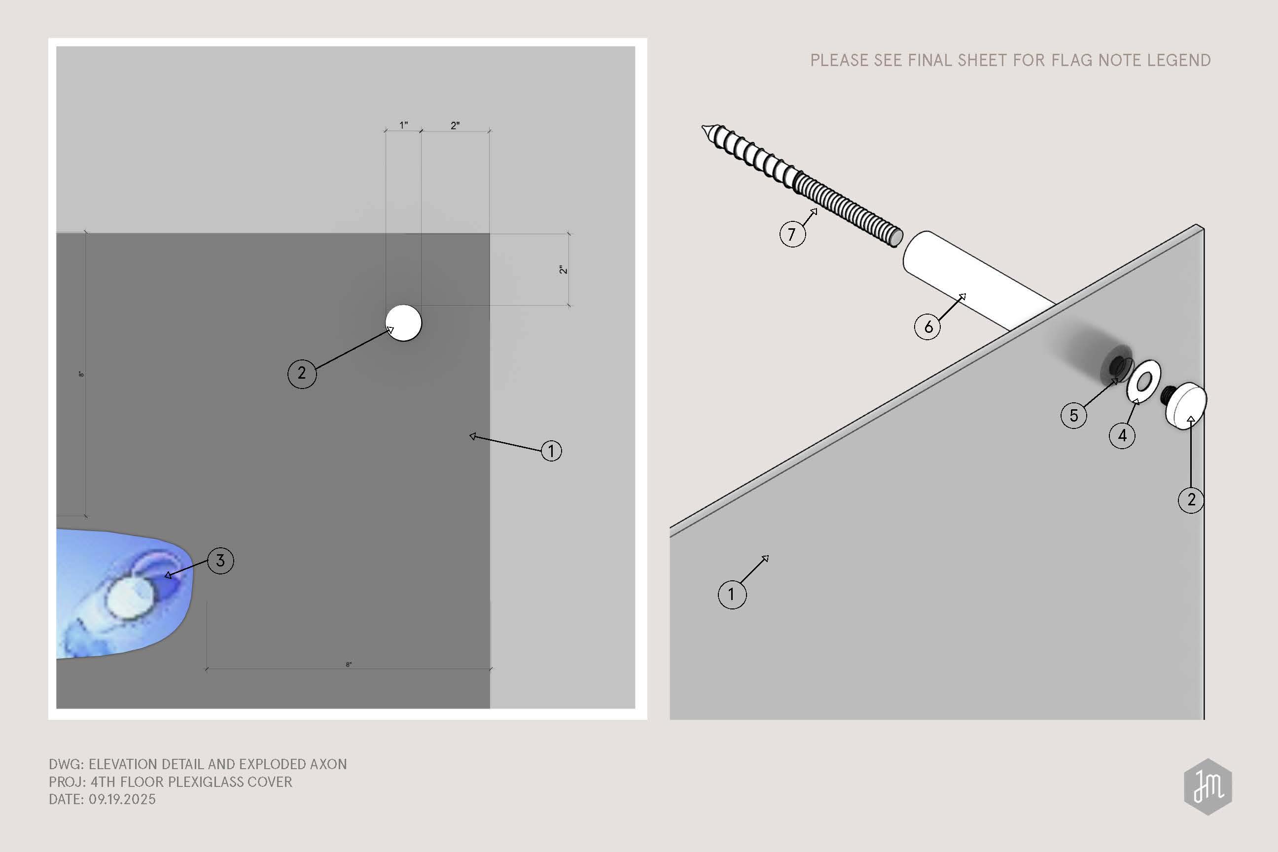 This technical package showcases the end-to-end process at Sheykhet Studios: from crafting a precise digital twin and realistic visual renderings, all the way to producing detailed technical documentation. In this example, the digital-to-physical workflow enabled the fabrication and installation of a protective plexiglass sheet, ensuring precision from concept to reality.